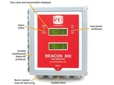 The Beaconª 800 is used for one to eight points of gas detection. It is microprocessor controlled and is capable of accepting up to 8 separate 4-20 mA sensor transmitters which can be either 2 or 3 wire. The Beaconª 800 can be powered by either 24 VDC, or 85-264 VAC. It is simple to operate and comes complete with a wall mount installation kit.