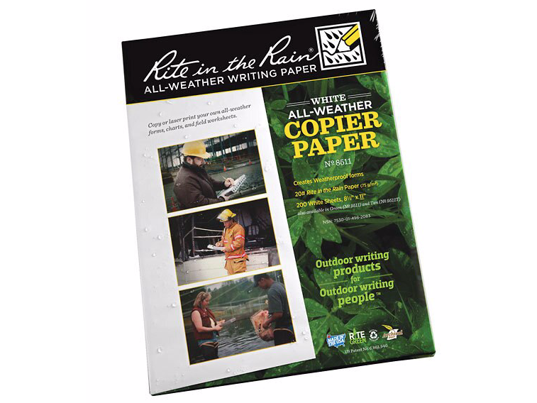 Copy or laser print your own all-weather forms, charts, maps, and worksheets on patented 8 1/2 in x 11 in Rite in the Rain All Weather Copier Paper. Now you can have the convenience of using your existing data sheets on a paper that can survive in any weather condition. For just pennies a sheet, Rite in the Rain enables you to work efficiently, regardless of the environment. Completely recyclable wood-based paper! Not for ink-jet printers. Copy or laser print both sides.